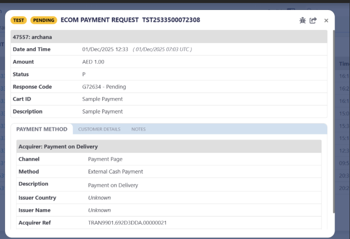 Once a COD payment request is created, the transaction will appear with a Pending status.