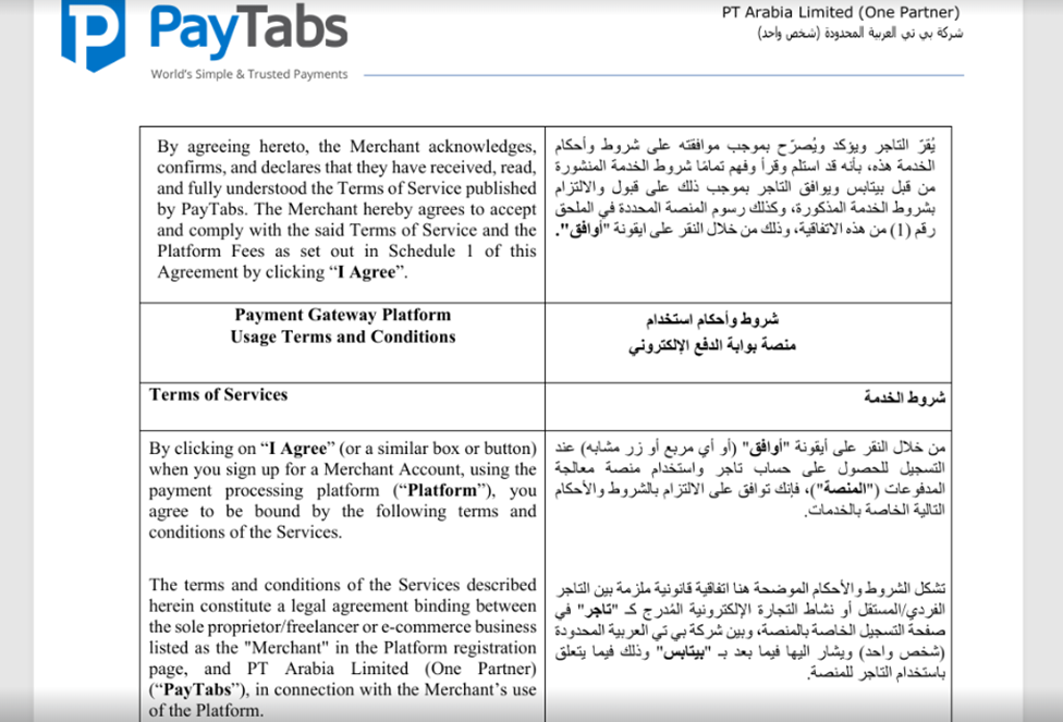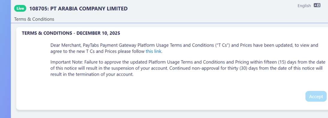 This enhancement ensures full clarity, transparency, and compliance for all merchant accounts operating under PayTabs Arabia in the Kingdom of Saudi Arabia. We encourage all merchant owners to review and confirm the updated terms promptly to avoid service interruptions.